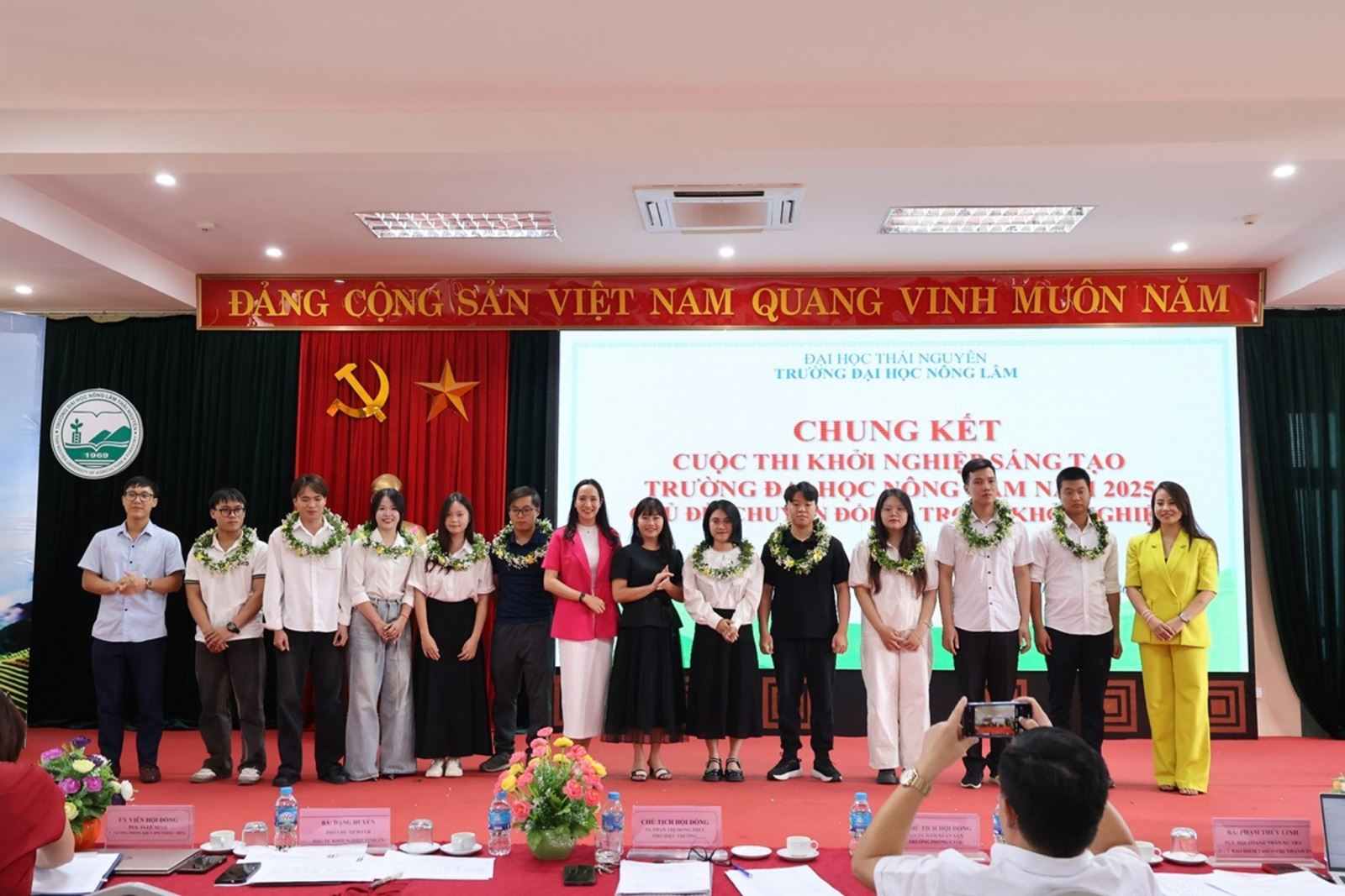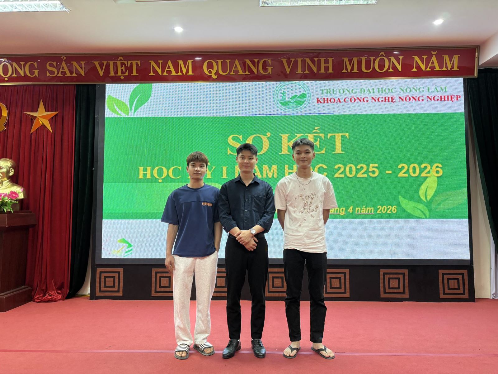 Ngày 03/04/2026, Khoa Công nghệ Nông nghiệp – Trường Đại học Nông Lâm Thái Nguyên đã tổ chức Lễ sơ kết Học kỳ I năm học 2025 – 2026 nhằm đánh giá kết quả thực hiện nhiệm vụ học kỳ vừa qua, đồng thời đề ra phương hướng, nhiệm vụ cho học kỳ tiếp theo. Tham dự buổi lễ có Thầy Triệu Xuân Hoà – Phó Trưởng phòng Đào tạo, Thầy Đỗ Quốc Tuấn – Phó Trưởng phòng Công tác Sinh viên, Thầy Dương Trung Dũng – Trưởng khoa Công nghệ Nông nghiệp, cùng toàn thể cán bộ, giảng viên và sinh viên trong Khoa. Trong Học kỳ I năm học 2025 – 2026, dưới sự chỉ đạo của Ban Chủ nhiệm Khoa, cùng sự nỗ lực của đội ngũ giảng viên và sinh viên, Khoa Công nghệ Nông nghiệp đã đạt được nhiều kết quả tích cực trên các mặt công tác. Trong lĩnh vực đào tạo, chất lượng học tập của sinh viên tiếp tục được nâng cao, nhiều tập thể và cá nhân sinh viên đạt danh hiệu Sinh viên Xuất sắc, Sinh viên Giỏi và Sinh viên Khá. Công tác giảng dạy, quản lý đào tạo được triển khai nghiêm túc, đảm bảo tiến độ và chất lượng theo kế hoạch. Hoạt động nghiên cứu khoa học và đổi mới sáng tạo của sinh viên diễn ra sôi nổi, đạt được nhiều kết quả đáng ghi nhận. Tiêu biểu, nhóm sinh viên của Khoa đã đạt Giải Ba chung cuộc với sản phẩm “Bánh quy chè tím” tại cuộc thi Đổi mới sáng tạo với chủ đề “Giảm thất thoát và lãng phí thực phẩm vì một tương lai bền vững” do Nhà trường phối hợp với FAO tổ chức. Bên cạnh đó, sinh viên Khoa còn đạt giải Ý tưởng Khoa học Công nghệ tại Chung kết cuộc thi Ý tưởng khởi nghiệp cấp Trường năm 2025. Đặc biệt, mô hình khởi nghiệp “Nuôi ốc nông nghiệp sinh thái tuần hoàn” do nhóm sinh viên K57 thực hiện bước đầu cho thấy hiệu quả và tiềm năng phát triển, góp phần gắn kết hoạt động đào tạo với thực tiễn sản xuất. Lễ sơ kết là dịp để Khoa Công nghệ Nông nghiệp nhìn nhận toàn diện những kết quả đã đạt được, đồng thời rút ra bài học kinh nghiệm, tiếp tục phát huy thế mạnh, khắc phục hạn chế, hướng tới hoàn thành tốt các mục tiêu của năm học 2025 – 2026. Trong thời gian tới, Khoa tiếp tục chú trọng nâng cao chất lượng đào tạo, đẩy mạnh nghiên cứu khoa học, khuyến khích tinh thần đổi mới sáng tạo và khởi nghiệp trong sinh viên.