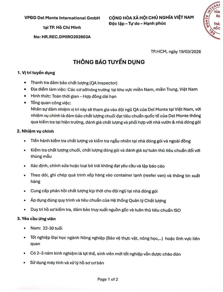 THÔNG BÁO TUYỂN DỤNG - Nhân viên Đảm bảo Chất lượng (QA) – Chuối xuất khẩu
